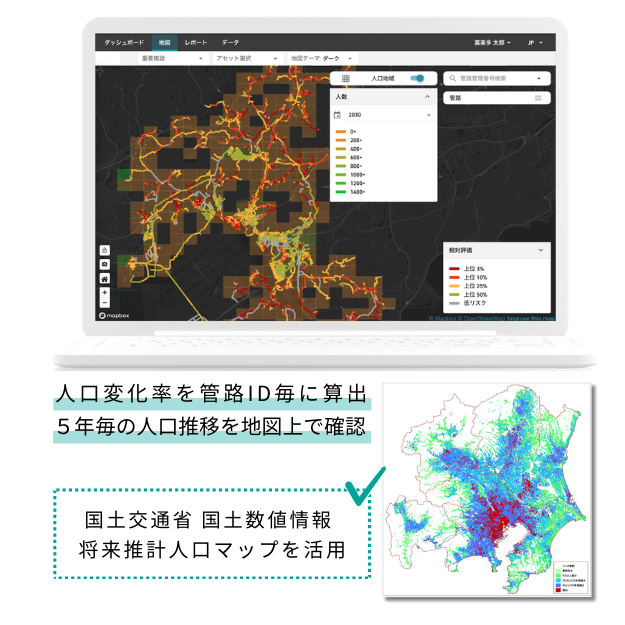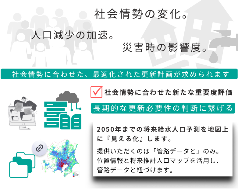 2050年までの将来給水人口を予測し、エリア別人口・変化率をそれぞれ地図上に『見える化』します。