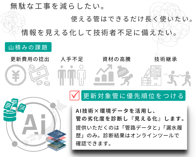 事業体様から提供いただく管路データ(布設年、管種、口径、位置情報等)及び漏水履歴と、独自に収集・構築した環境データベースに基づき、機械学習のアルゴリズムを用いて診断しています。